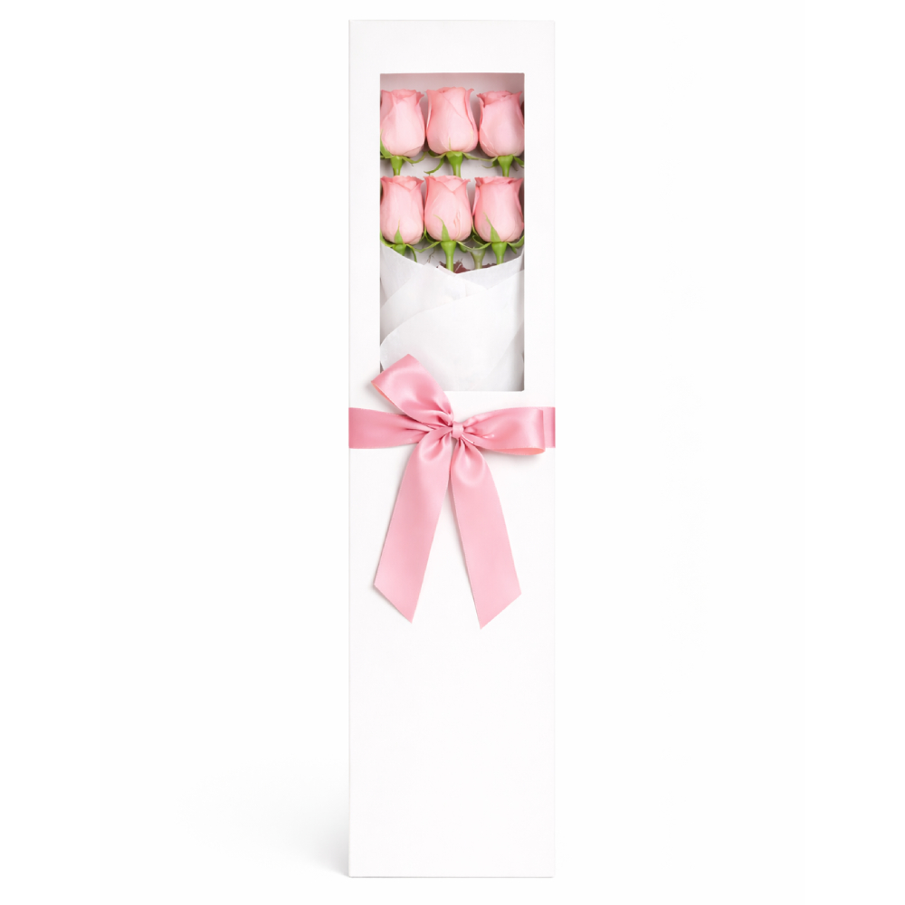 ¡Un detalle que encanta! Regala esta caja con 6 rosas rosadas. El obsequio perfecto para celebrar la ternura. ¡Inolvidable!