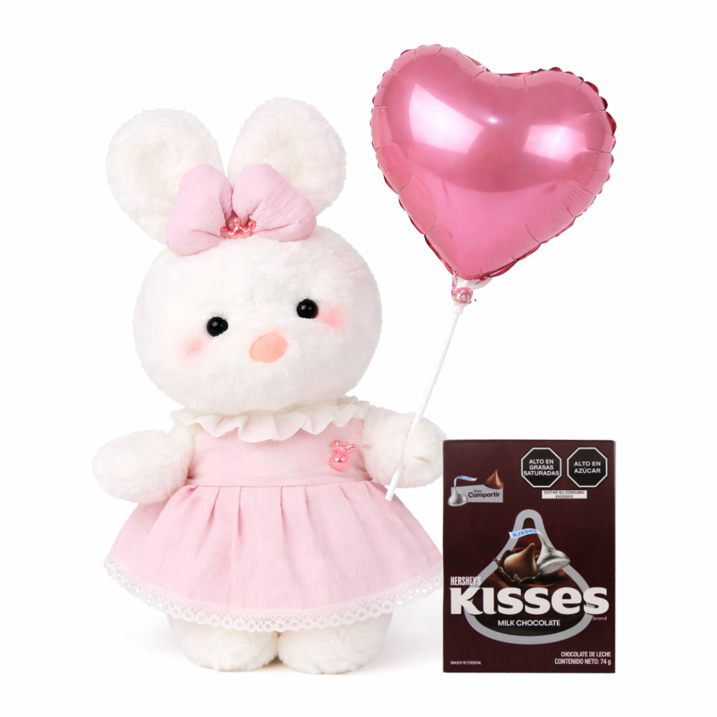 Este tierno set incluye una encantadora conejita de peluche, un delicioso chocolate Hershey’s y un globo especial, creando el detalle perfecto para alegrar el día de quien más quieres. 🎀🍫🎈