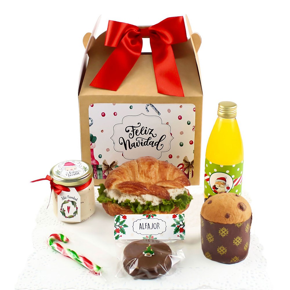 Desayuno Box Navideño: Croissant con Pollo 🥐, Yogur, Jugo de Naranja 🍊, Panetoncito, Alfajor y Bastón de Caramelo. ¡El festín perfecto para tu mañana! 🎁