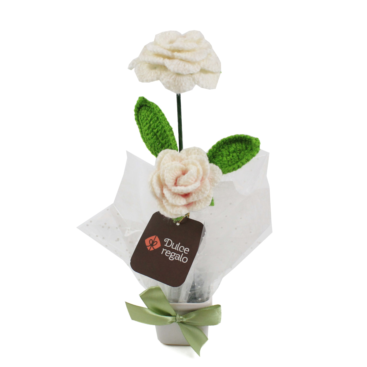 Obsequia pureza y elegancia con un maceterito de 2 rosas blancas tejidas a crochet. Un detalle artesanal, delicado y eterno que expresa amor sincero y paz.