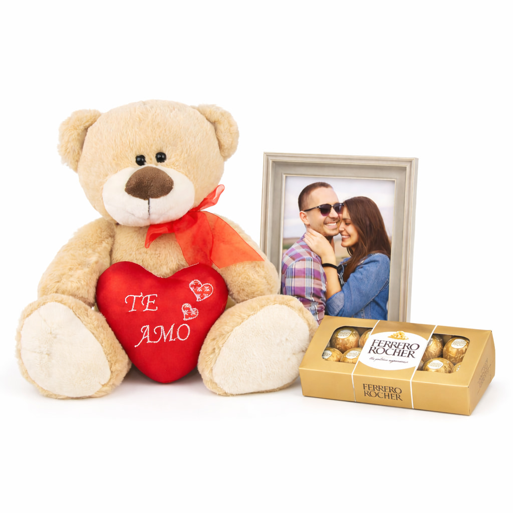 Haz que ese momento especial dure para siempre. ❤️ Este set combina la ternura de un oso de peluche extra suave, el sabor clásico de los chocolates Ferrero Rocher y un portarretrato con tu foto personalizada para recordar ese gran momento.