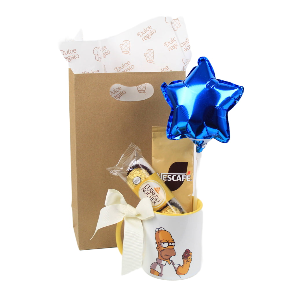 Endulza su día con el pack Taza del famoso Homero Simpson, chocolate Ferrero Rocher y cappuccino Nescafé. Un detalle para fans de la serie.