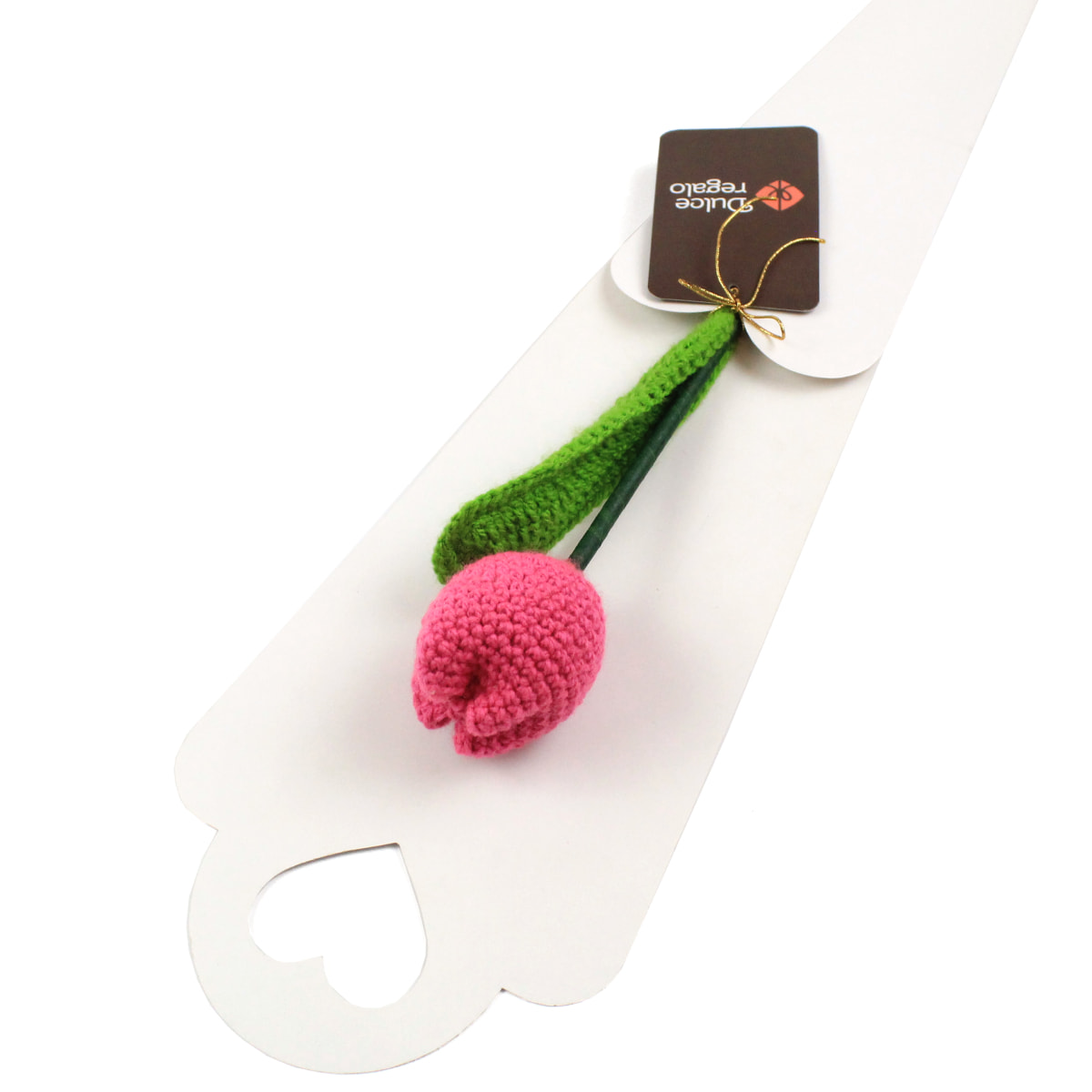 Sorprende con un tulipán rosado intenso tejido a crochet, un regalo artesanal y duradero que simboliza admiración, cariño profundo y dulzura especial.